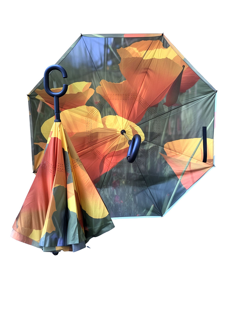 Red Haute Blue Inverted Umbrellas close in reverse to keep the water inside when closing and they stand up on their own - no need for an umbrella bucket! The c-shaped handle can be worn on the wrist or forearm or hung from a counter top lip/doorknob/grocery cart handle. The vibrant designs and unique functionality make these umbrellas rainy day must-haves! Bonus, they make fabulous sun parasols for the sunnier months.